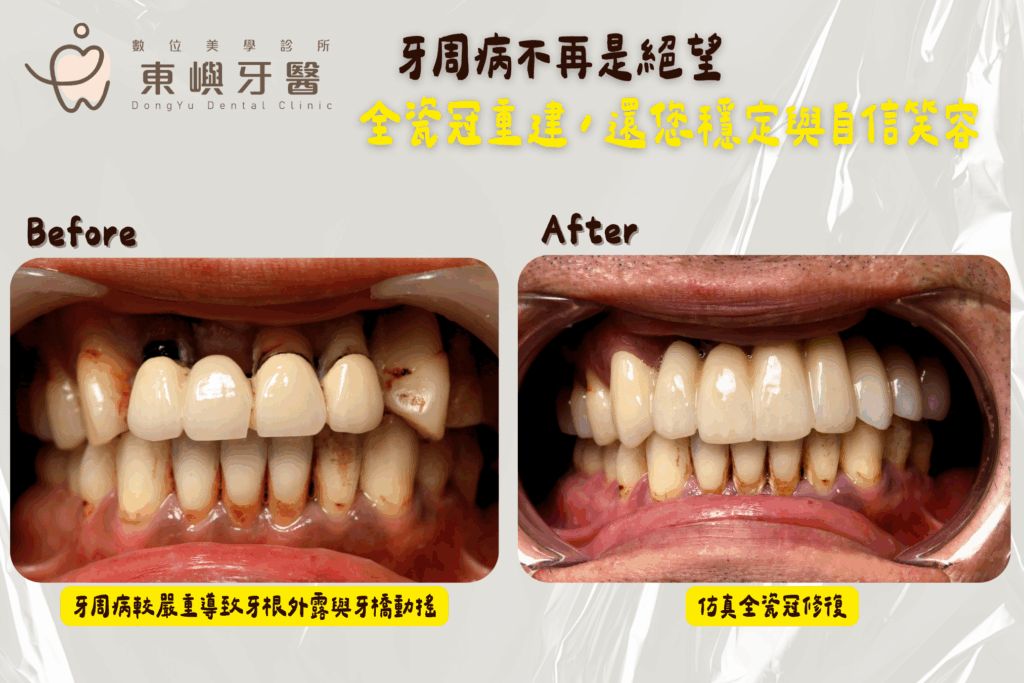 每一個笑容都有屬於自己的故事,如果你也正被牙周病或牙齒鬆動困擾,別讓不安繼續影響生活。東嶼牙醫團隊將以專業與細心,為你量身打造最合適的治療方案,陪伴你找回自在的笑容與自信。