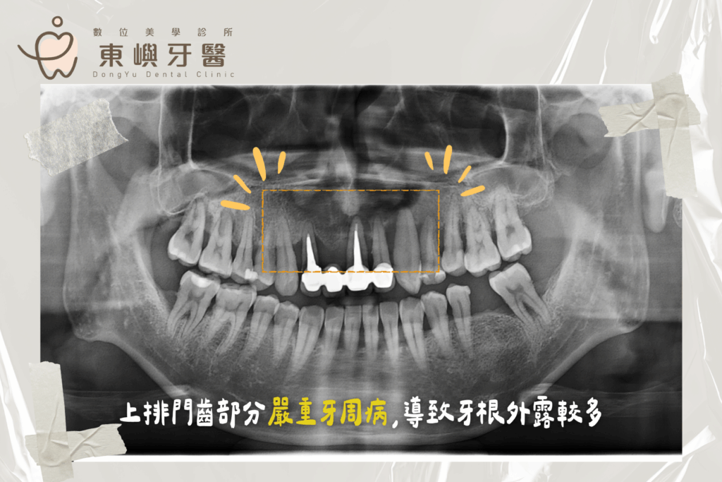 長年未被察覺的牙周狀況,悄悄侵蝕了他的前牙支撐。原本應該堅固的牙橋,開始晃動,牙根逐漸外露,連說話和咀嚼都帶來不便。最讓他在意的,是在社交場合時,那種「害怕開口大笑」的尷尬。