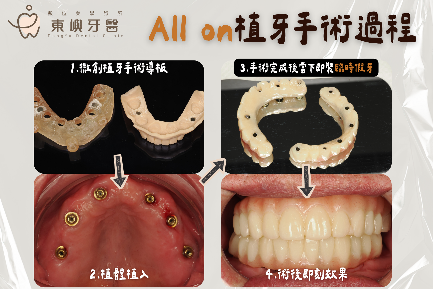 經過詳細檢查與討論後,醫師與患者共同決定進行 全口拔除搭配All-on全口重建 的治療方案。這不只是口腔治療,更是一場關於生活品質與自我信心的重啟。