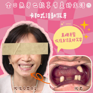 60歲女性長期受缺牙困擾,傳統活動假牙鬆動影響日常飲食、講話與生活自信。透過卡扣式活動假牙治療,她恢復穩定咬合、自然笑容與自信生活,不僅吃飯與講課更加自在,也改善社交和專業形象,是缺牙患者值得參考的可靠治療選擇。