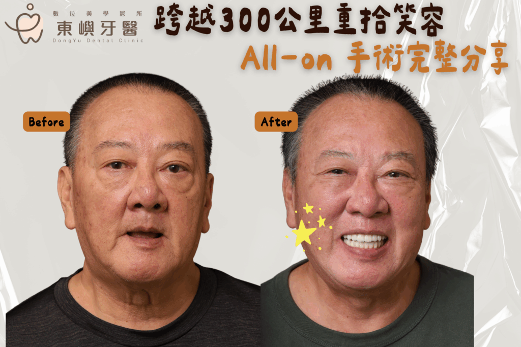 這篇文章紀錄一位跨越300公里求醫的全口重建案例,從牙齒搖晃、無法咀嚼,到透過 All-on 全口重建成功恢復咀嚼功能、改善臉型並重拾自信。內容也完整回答手術流程、恢復期、疼痛、舒眠麻醉與術後注意事項。